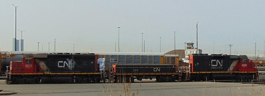 On 14 August 2019 at about 1000, a CN yard assignment pulled a cut of 24 long, empty autorack cars from the auto compound to the north end of W100. The autorack cars were each about 94 feet long and were equipped with 60-inch-long couplers and long-travel (10-inch) hydraulic end-of-car cushioning devices (EOCCD).