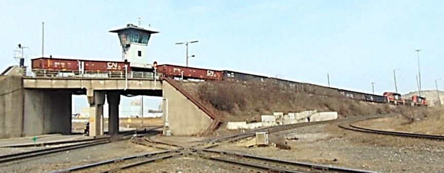 A control tower is located at the crest of the dual hump. From the crest of the hump, freight cars from the pullback tracks are slowly pushed, uncoupled and released (Figure 3).
