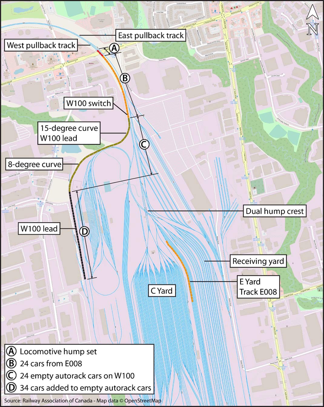 MacMillan Yard is CN’s main rail classification yardFootnote 3 in Eastern Canada, where rail traffic is distributed by flat switching or humpingFootnote 4 rail cars into various tracks for placement on different trains. MacMillan Yard operations are conducted under Canadian Rail Operating Rules (CROR) Rule 105. Train movements are restricted to a maximum speed of 15 mph. They must also be able to stop within half the range of vision of equipment and stop short of a misaligned switch, a derail in the derailing position as well as blue flagFootnote 5 or red flagFootnote 6 track protection.