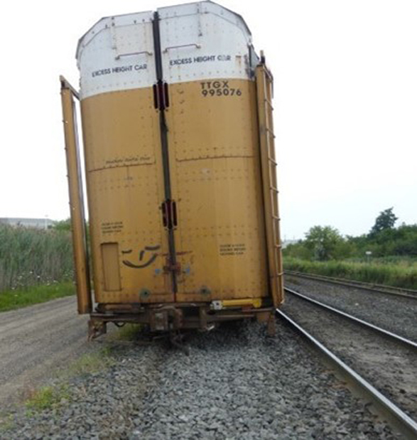 The 26th car, empty autorack car TTGX 995076, had derailed but came to rest upright. The leading A-end truck did not derail but all 4 wheels of the trailing B-end truck were derailed in the ballast on the west side of the track, just north of the W100 switch (Figure 5). As the car came to rest, it struck and damaged the W100 switch. The remainder of the head-end cars were inspected with no defects noted.