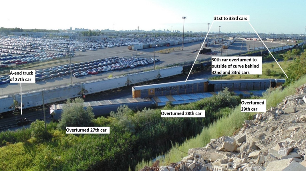 The trucks of the 28th and 29th cars were subsequently strewn about the site by the trailing cars as they derailed. The 29th car had separated from the 30th car. The 30th car had overturned and came to rest on the outside of the curve, parallel to the track.