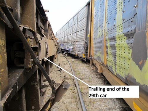 The trailing B-end truck of the 26th car had derailed, but the trucks from the 27th to 29th cars did not initially derail.