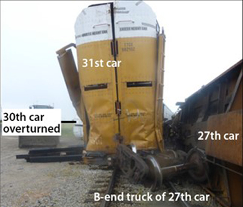 The A-end truck of the overturned 27th car (TTGX 995540) rolled clear of the car and came to a stop on the track just north of the car. The B-end truck of the 27th car was generally intact but was impacted by the leading end of the 31st car (TTGX 982102) during the derailment. The B-end truck of the 27th car came to rest just ahead of the 31st car which was adjacent to B-end of the 27th car (Figure 9).