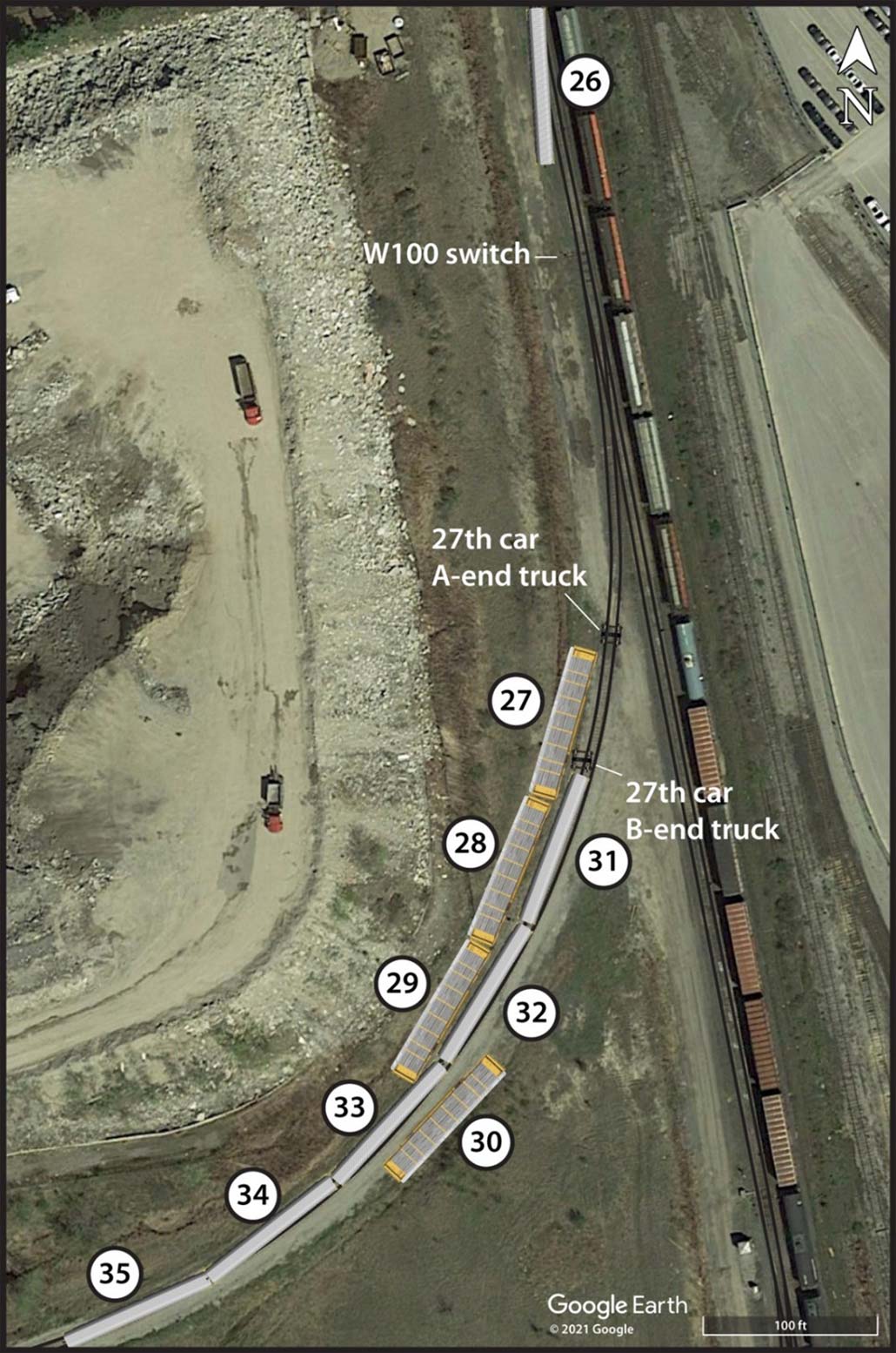 The locomotive hump set and the first 26 cars came to rest coupled together with the head end positioned about 2100 feet north of the W100 switch on the west pullback track.