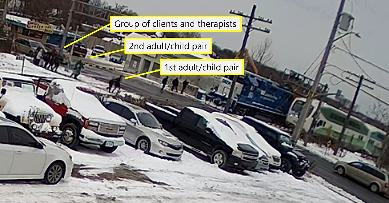 The north track was occupied by CN freight train L56831-13 (CN 568), which was backing up into the yard. The group of 6 adult therapists and 5 child clients waited on the northwest quadrant sidewalk for an estimated 5 to 10 minutes in cold weather for CN 568 to slowly clear the crossing and the GCWD to deactivate (Figure 1).