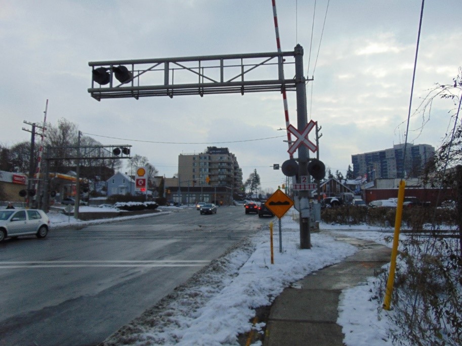 At this location, Lancaster Street West crosses 2 sets of railway tracks, both owned by Metrolinx: the south track is the Guelph Subdivision main line, and the north track is a siding. The lead track to Canadian National Railway Company’s (CN) Kitchener Yard joins the siding at Mile 62.05.