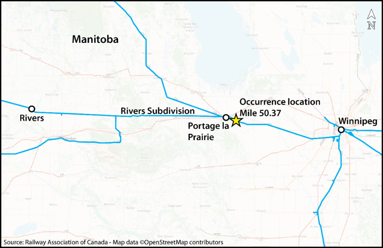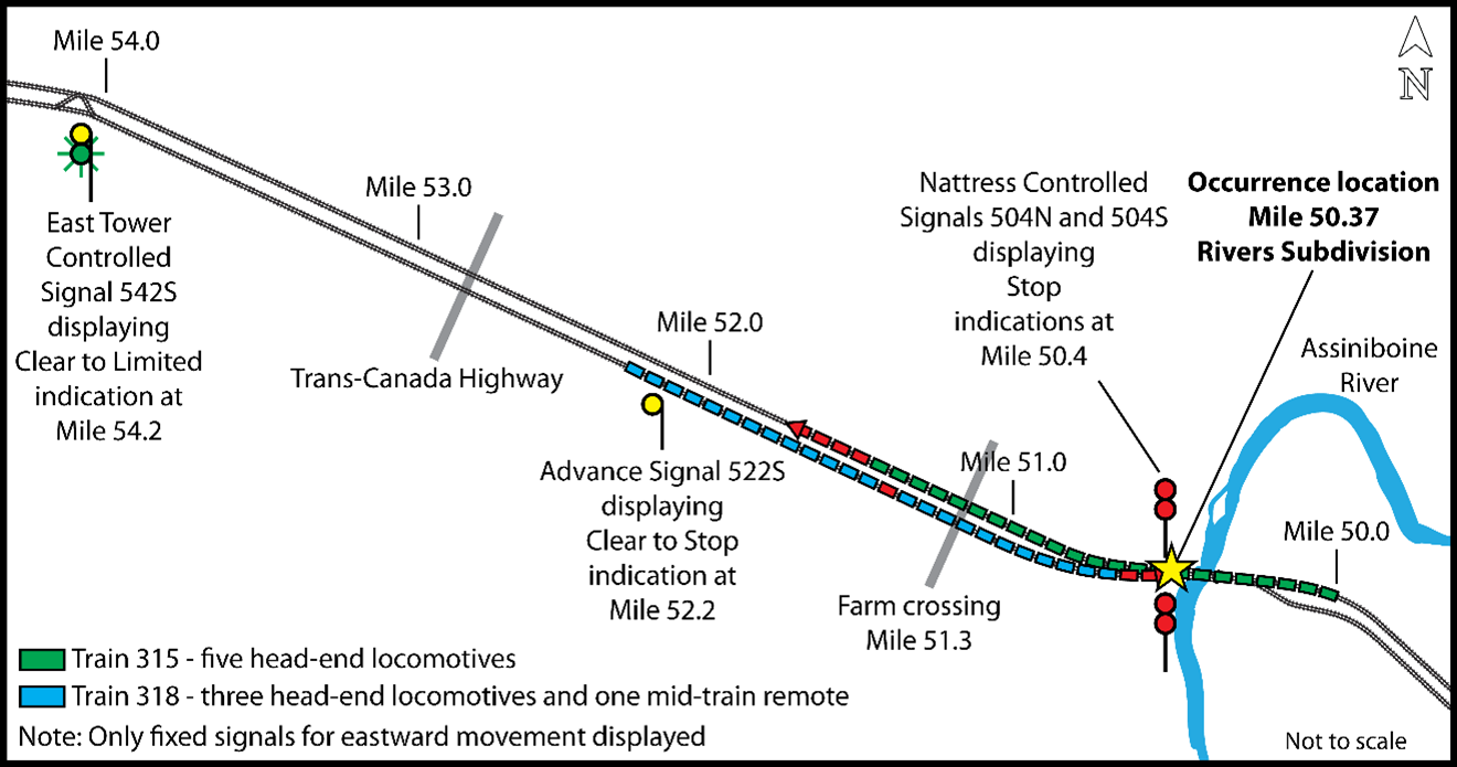 On 03 January 2019, about 0610 Central Standard Time,Footnote 1 Canadian National Railway Company (CN) eastbound freight train M31851-01 (train 318) began following eastbound CN train Q11651-30 (train 116) near Rivers, Manitoba, on the CN Rivers Subdivision. Both trains were destined for Winnipeg, Manitoba. Train 318 was a key trainFootnote 2 operating on a key route,Footnote 3 as defined by the Transport Canada (TC)–approved Rules Respecting Key Trains and Key Routes.