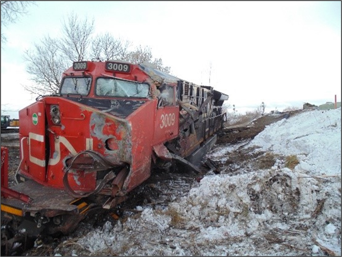 The 2 lead head-end locomotives on train 318 (CN 3009 and GECX 7371) both remained mainly upright but had derailed all wheels. The lead locomotive (CN 3009) came to rest at about a 45-degree angle from the track, partway down the south embankment. The north side of both locomotives had sustained damage. Lead locomotive CN 3009 was extensively damaged (Figure 3) while GECX 7371 exhibited some impact damage and scrapes. The fuel tanks on both locomotives were punctured, which resulted in the loss of a combined total of about 3500 imperial gallons (15 911 litres) of diesel fuel. The fuel was contained locally during site remediation and was subsequently cleaned up. No waterways were affected.