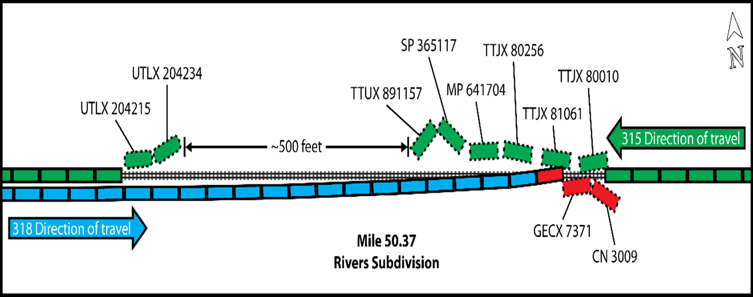 As CN train 318 was proceeding on the south track, a westbound CN freight train M31541-03 (train 315) was transitioning from single track to the north track while exiting the equilateral turnout (Mile 50.37) at Nattress near Portage la Prairie, Manitoba.