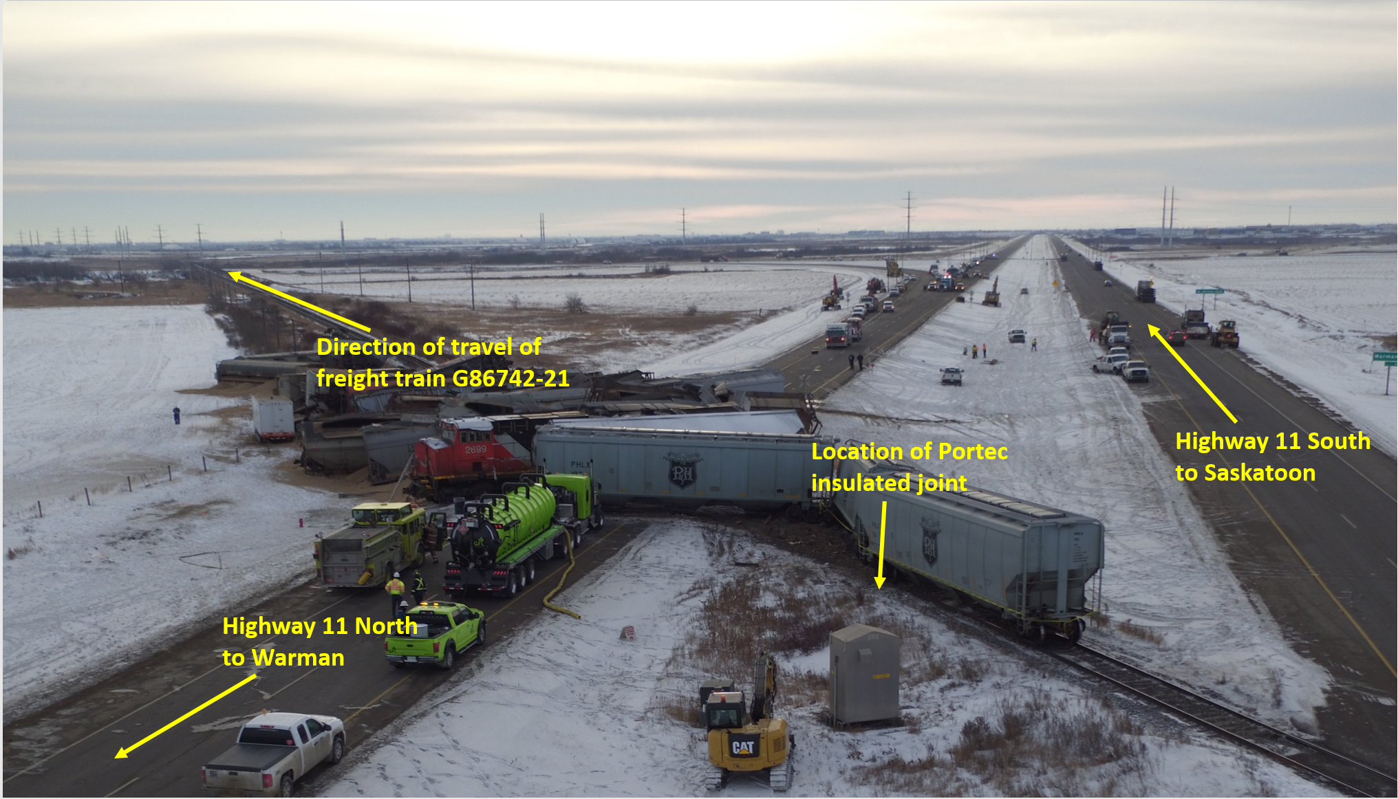 On 22 January 2019, at about 0925 Central Standard Time, Canadian National Railway Company freight train G86742-21, travelling southward at 31 mph on the Warman Subdivision, experienced a train-initiated emergency brake application near Saskatoon, Saskatchewan. After the train came to rest, the train crew determined that 29 cars and the mid-train locomotive had derailed. Many of the derailed cars were piled up on the northbound lanes of divided Highway 11, blocking the crossing. Some of the derailed cars lost their containment, releasing their load of grain. The mid-train locomotive caught on fire; the fire was quickly extinguished. There were no dangerous goods involved. There were no injuries.