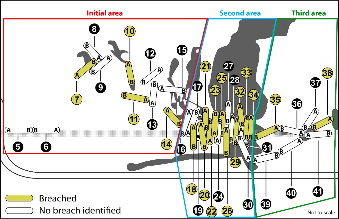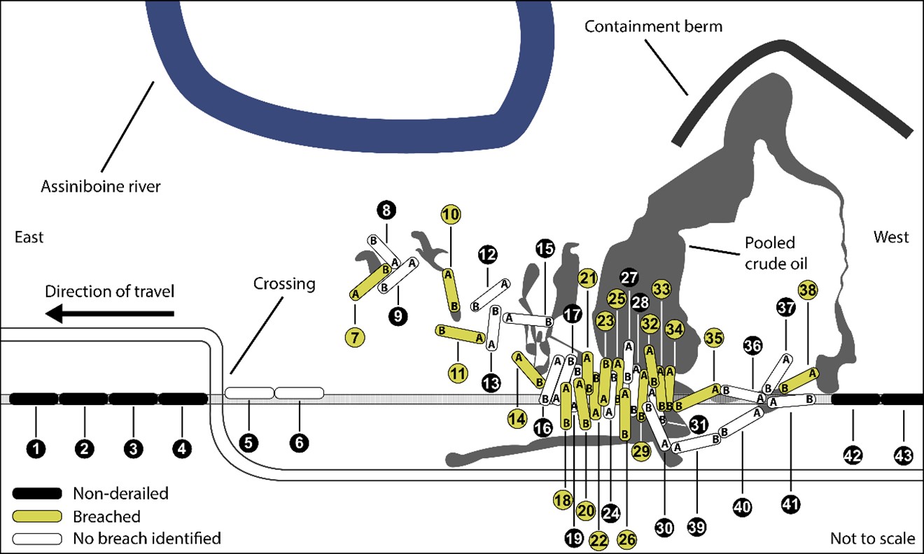 The 7th to the 41st tank car (35 cars) all sustained some form of impact damage during the derailment. Damage to tank shells, tank heads, bottom outlet valves (BOV), manways and protective housings resulted in 17 of the 35 cars being breached.Footnote 9