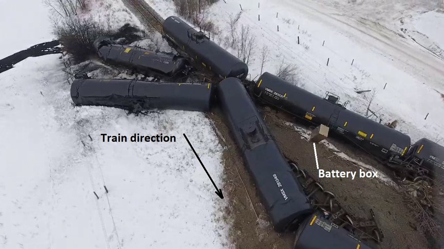 Video from the lead locomotive forward-facing video recorder showed that, just after the locomotive passed a battery box at Mile 197.48 of CN’s Rivers Subdivision, there was a noticeable vibration of the recorded image and a loud noise was heard. Nine seconds later, the train went into emergency as 37 Class 117R tank cars, located in the 5th to the 41st positions behind the lead locomotives, derailed.