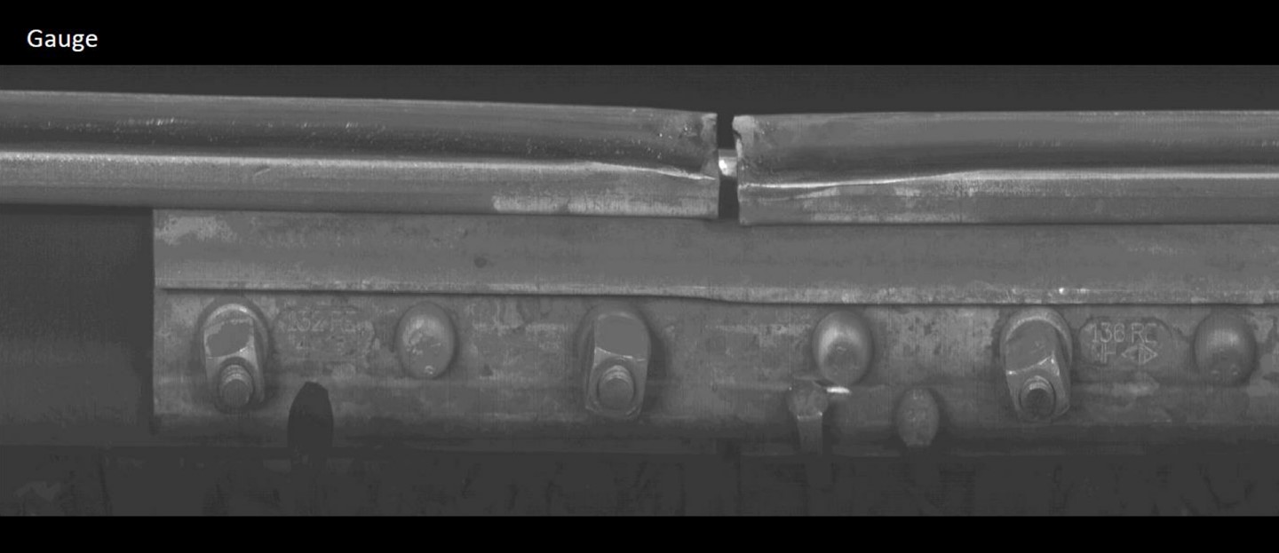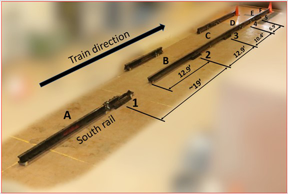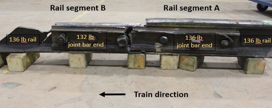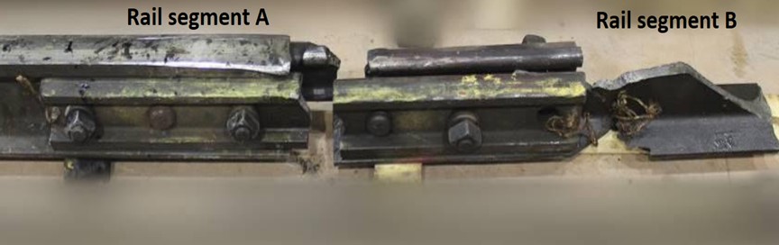 Video evidence, the presence of impact marks observed on the south-side wheel treads of the 1st to 5th cars behind the lead locomotives, and the condition of the broken joint bars in joint 1 indicate that the accident occurred when joint 1 in the south rail failed beneath the crude oil unit train.