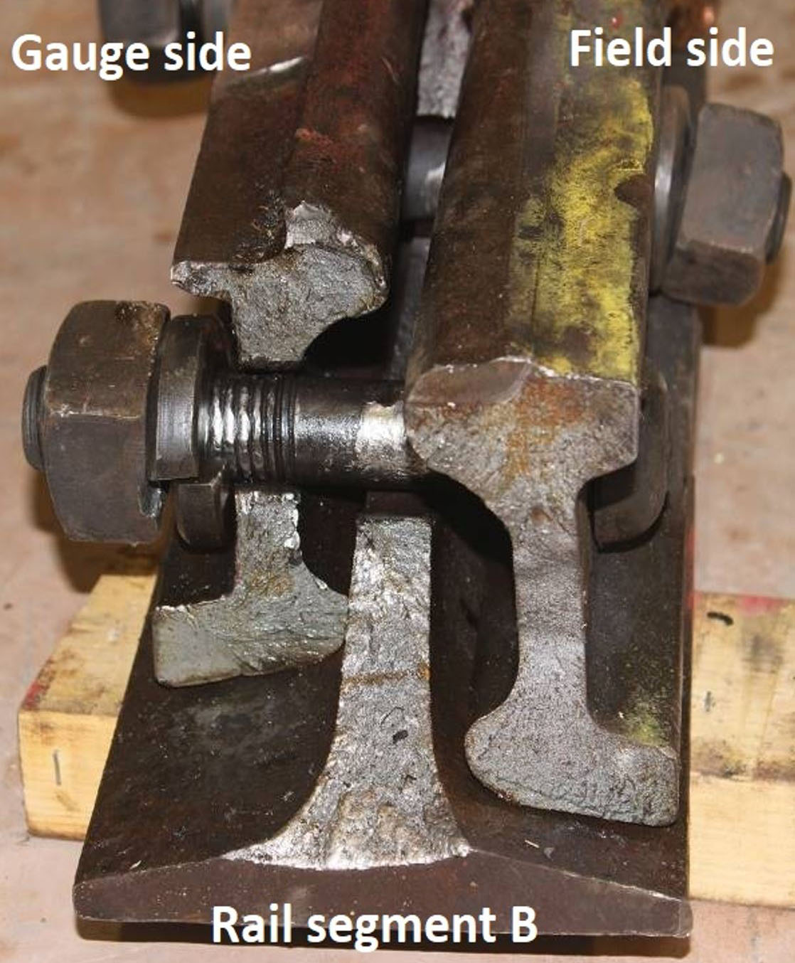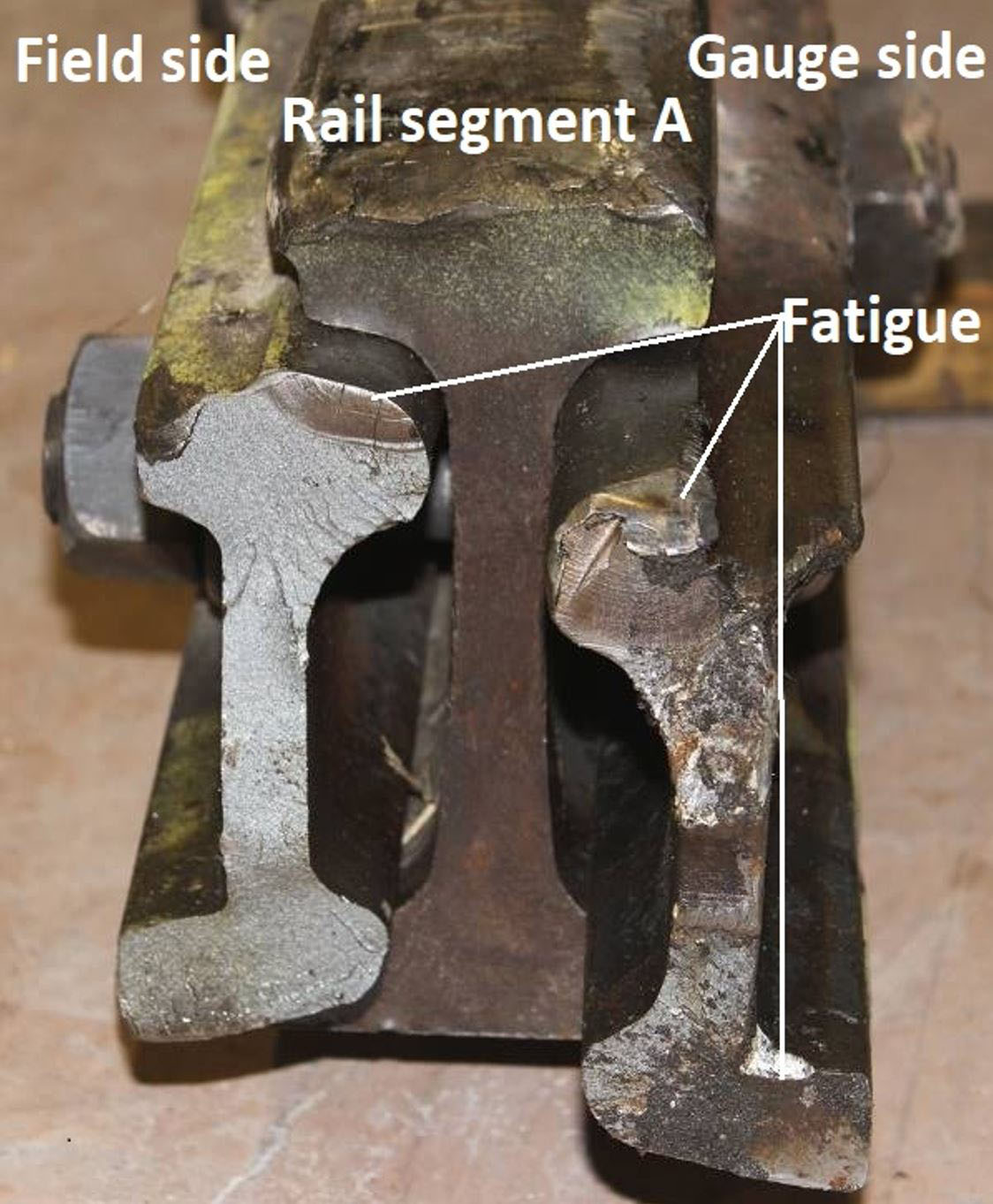 Over a 6-week period, the misalignment of joint 1 led to a loosening of the joint, which initiated fatigue cracking in the joint bars. The joint bars failed when instantaneous overstress fractures occurred from the extremities of the fatigue cracking and extended through the remaining joint bar cross-sections which could no longer withstand the normal service loads applied as the train traversed the area.
