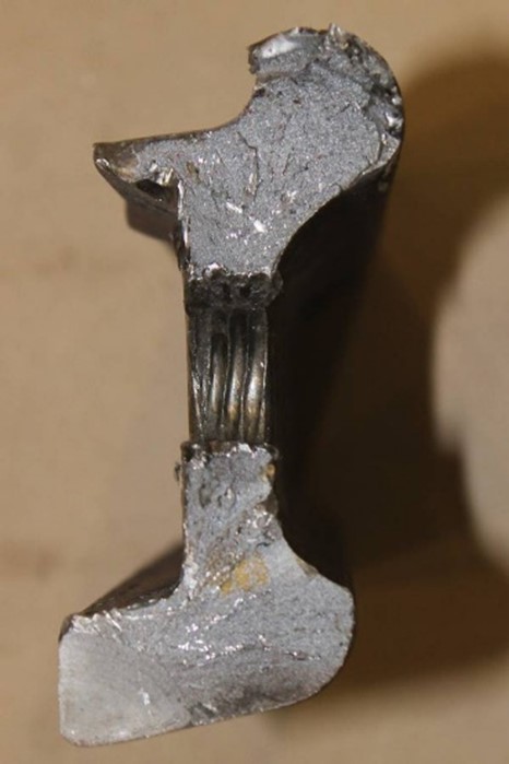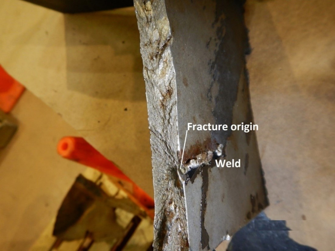 In the vicinity of Mile 197.47, pieces of the south rail, joint bars and joint bar fasteners were recovered. Among the recovered pieces of rail, there were 5 joints, all located within a distance of 49 feet. Two of the joints had broken joint bars while the remaining 3 joints were still intact. The fracture surfaces of 1 set of broken joint bars from about Mile 197.47 displayed features consistent with fatigue cracking (Figure 6). The recovered track components were sent to the TSB Engineering Laboratory in Ottawa, Ontario, for analysis.