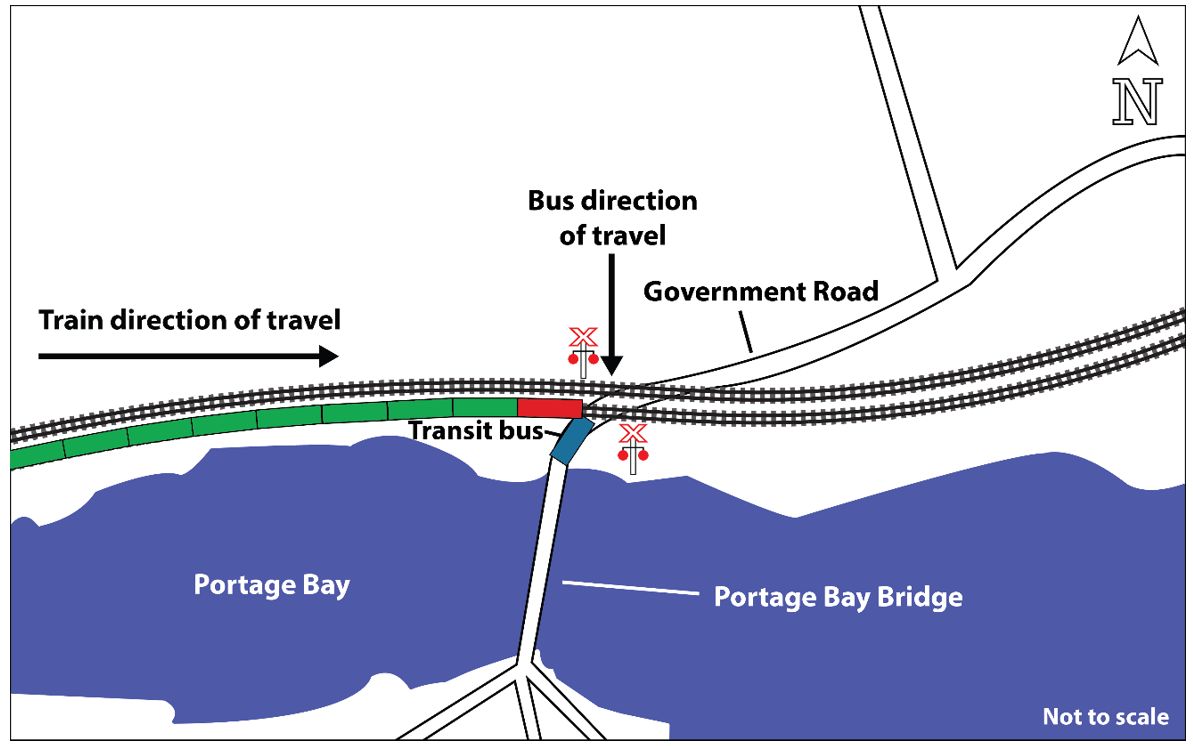 At 0934, while proceeding at 37 mph on the south main track,Footnote 2 the train collided with the rear end of a City of Kenora transit bus, operating on the Keewatin bus route. The collision occurred at the Government Road public railway crossing in the City of Kenora, located at Mile 3.15 of CP’s Keewatin Subdivision (Figure 2). The crossing was protected by grade crossing warning devices (GCWD), which consisted of automated flashing lights, bell and gates. After traversing the crossing, the transit bus had stopped on Government Road with the right rear corner of the bus foul of the south main track.