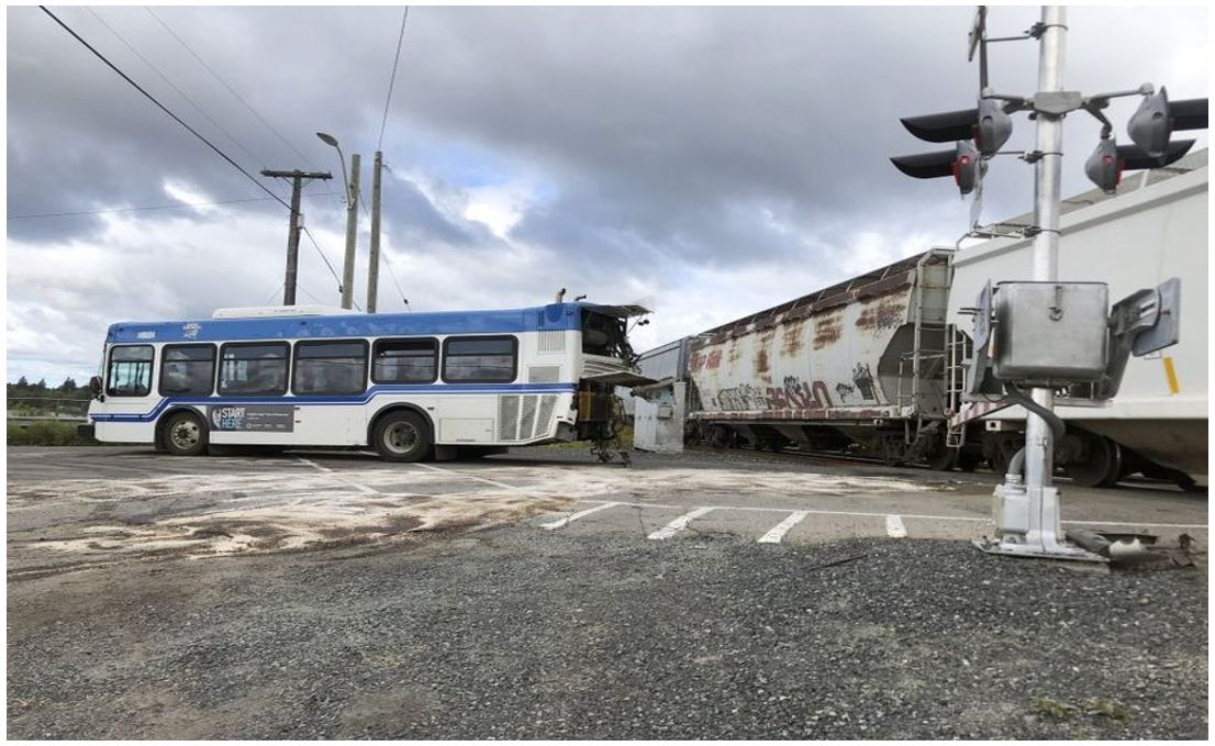 At about the same time, a passenger using a cane stood up and moved forward in the bus trying to get the driver’s attention. The bus then completed the left turn and crossed the tracks before the crossing gates came down. The driver stopped the bus on the south side of the crossing, unaware that the rear end of the bus was foul of the south main track.