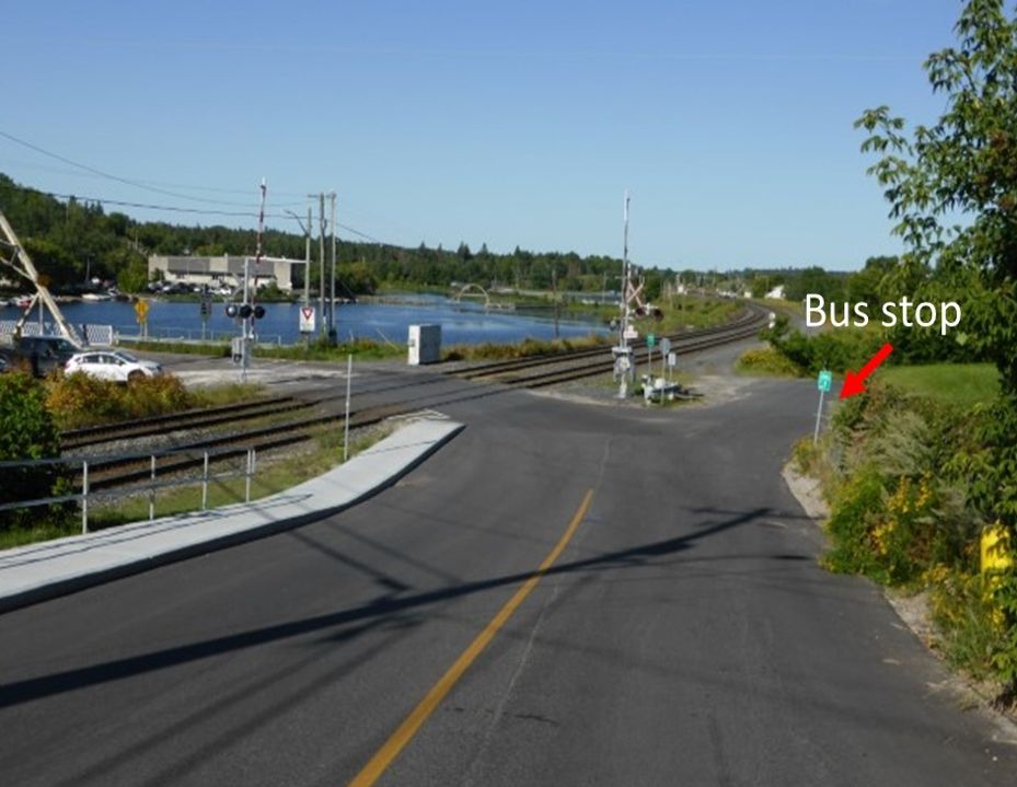 On the day of the occurrence, at about 0933, the bus was travelling south on the descending grade of Government Road approaching the city bus stop at the base of the road, just before the crossing (Figure 4). The driver observed a train approaching in the distance. The lights and bell at the crossing were activated, but the gates had not begun to descend. At that time, no passengers were waiting at the bus stop.