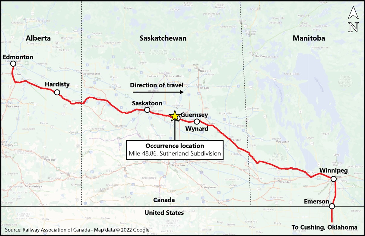 At about 0010 on 09 December 2019, the train was proceeding eastward at 44 mph on the Sutherland Subdivision. As the train approached the public passive crossing at Wolverine Road (Mile 48.85), located about 7 km west of Guernsey, Saskatchewan (Figure 1), the crew observed a gap in the south rail. As the head-end locomotive contacted the gap, it dipped to the south. Immediately afterward, a train-initiated emergency brake application occurred. The crew looked back and observed a large explosion as the head-end locomotive and first car separated from the train. Numerous tank cars on the head end of the train had derailed and were on fire.
