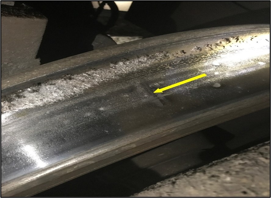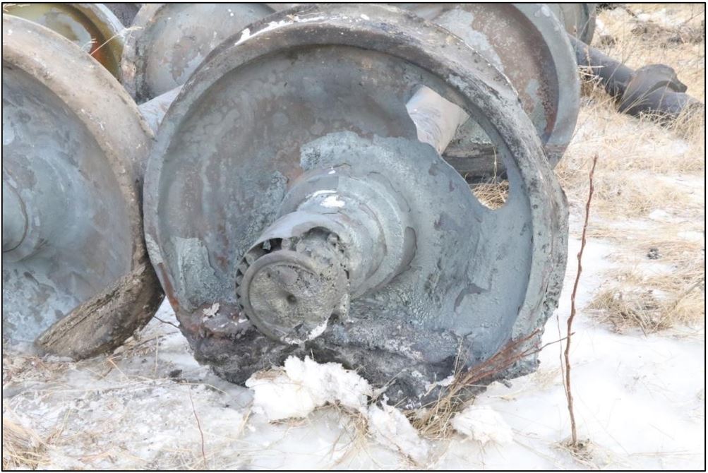 The first car in the train consist, a covered hopped car loaded with sand, had derailed but remained coupled to the head-end locomotive and traversed the crossing. All of the south wheels on the head-end locomotive exhibited transverse impact marks on the wheel treads (Figure 2).