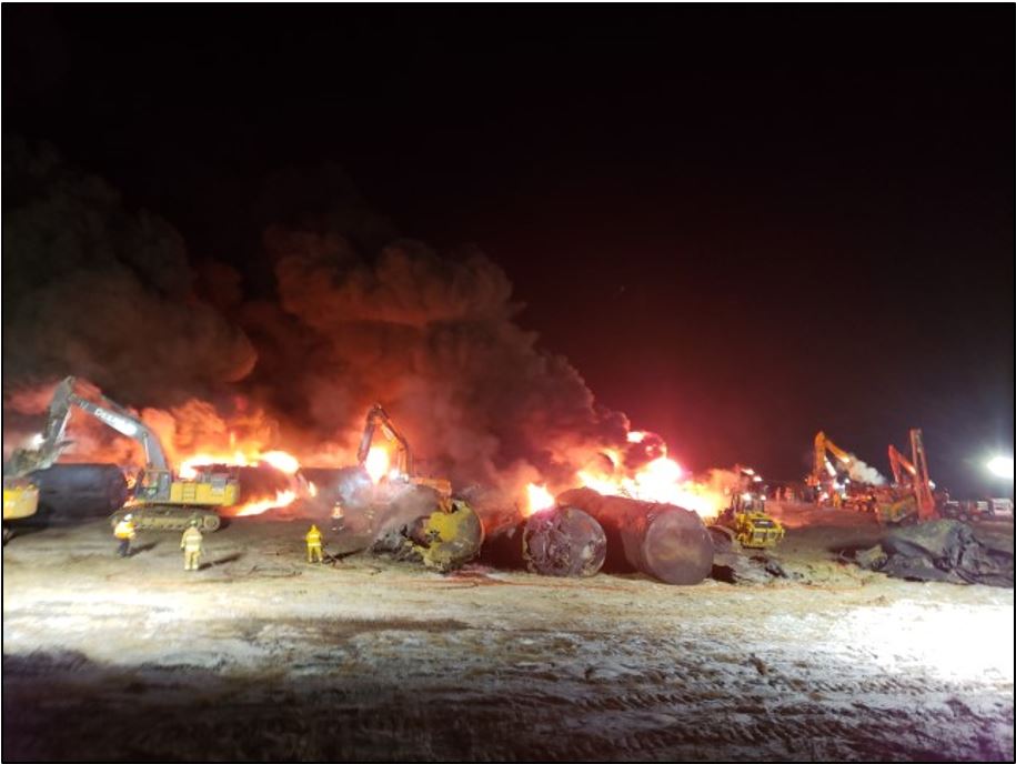 CP set up an on-site incident command centre and a unified incident command structure that included all responding agencies. The Lanigan fire chief assumed the role of incident commander. The derailment site was secured, and all access points were controlled. Due to the DG release, Wolverine Road and nearby Highway 16 were closed in the vicinity of the derailment. Roadways were re-opened to vehicular traffic at about 1500 on 12 December 2019. The immediate emergency response focused on firefighting efforts. During the first 12 hours, firefighting was defensive, attempting to maintain control of the pool fire (Figure 6).