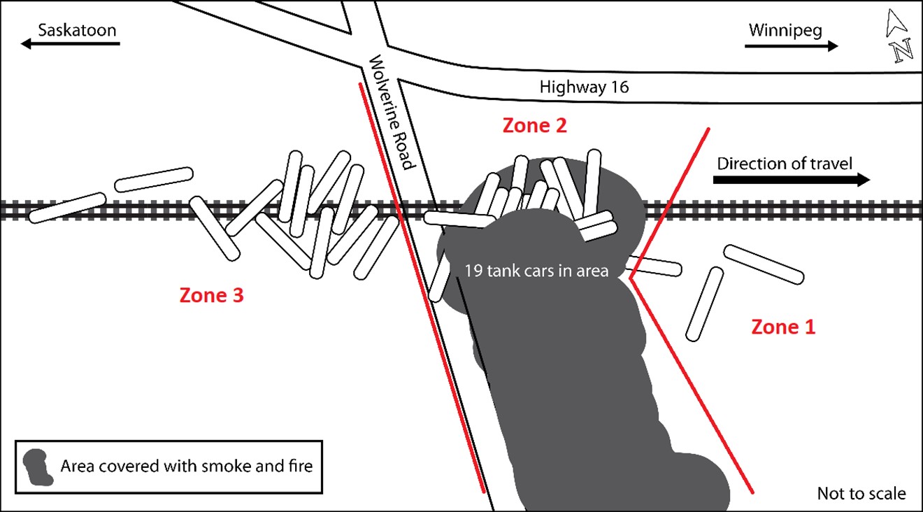 First on the scene were the Royal Canadian Mounted Police, the Lanigan fire department, and the Lanigan emergency medical services. CP responded with senior company officials, mechanical and engineering staff, hazardous material specialists, and its police services. Other responding agencies included Transport Canada (TC) and the Saskatchewan Ministry of the Environment. Multiple response contractors and environmental consultants were also mobilized and attended the site to support the emergency response and site mitigation.