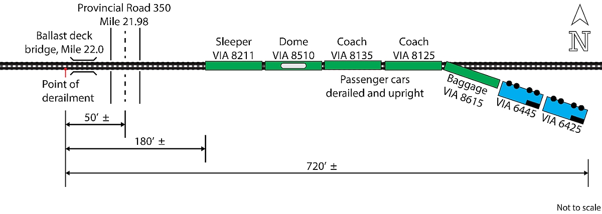 VIA 692 consisted of 2 head-end locomotives (VIA 6425 and VIA 6445), 1 baggage car, 2 passenger coaches, 1 dome/dining car and 1 sleeper car. The train weighed about 560 tons and was 537 feet long. The VIA operating crew consisted of 2 locomotive engineers (LEs)—an operating LE and an in-charge LE who has duties similar to a conductor. There were also 3 members of VIA’s on-board service personnel and 8 passengers throughout the cars. The VIA operating crew members were qualified for their positions, met fitness and rest requirements, and were familiar with the territory.