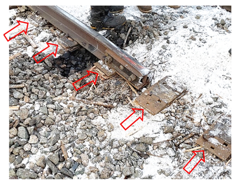 The broken joint was located at the east end of a 22-foot-long plug rail that had been installed in the south rail on 10 March 2019. Several tie plates under the joint had plywood shimsFootnote 2 that appeared to have been recently installed (Figure 3).