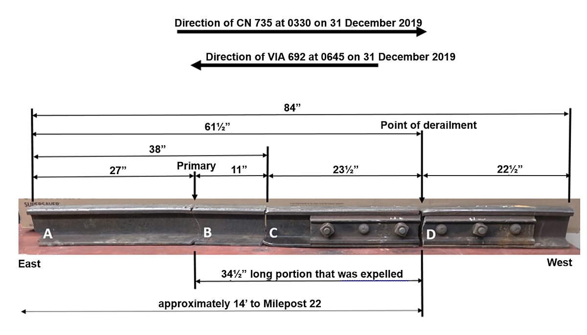 The observed pattern of the rail head impact damage indicated that the rail and joint bar failures likely occurred under westbound CN 735. The failures (breaks B, C, and D) occurred progressively and led to the expulsion of a section of the south rail, creating a gap of 34½ inches as CN 735 traversed and exited the area. The next train, eastbound VIA 692, could not bridge the gap and immediately derailed to the south side of the track at the west end of the failed joint.