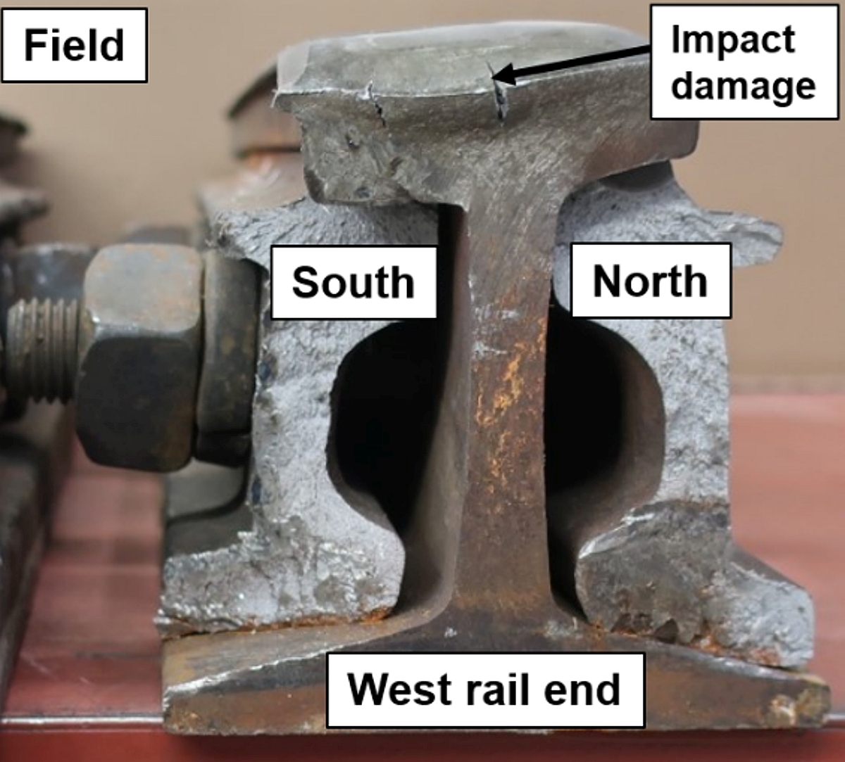 The exposed fracture surfaces of joint D displayed pre-existing fatigue cracks in the top surface of the joint bars that fit the radius between the rail head and web. Although joint bar cracks typically occur in these locations, they are very difficult to detect by visual examination. The west-end rail exhibited heavy impact damage that was also consistent with a westbound movement (CN 735) (Figures 6 and 7).