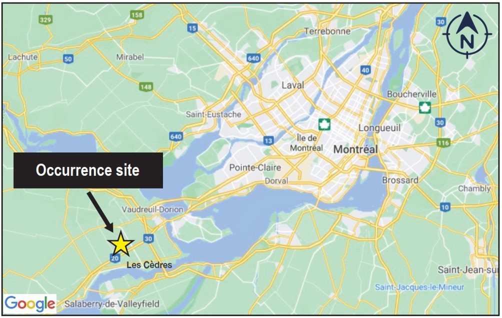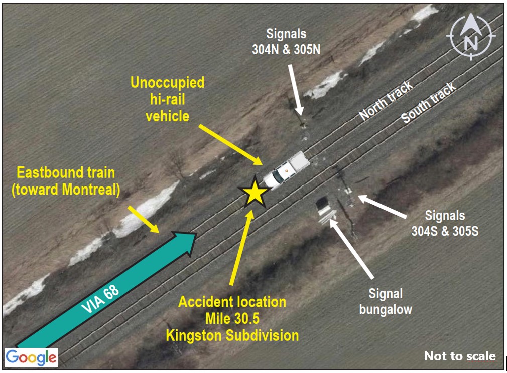 At about 2132,Footnote 1 the train was travelling east at the authorized speed (95 mph) on the north main track of the Canadian National Railway Company (CN) Kingston Subdivision. As the train approached Mile 31, the 2 engineers on board the locomotive noticed a bright light in the distance. When the operating locomotive engineer realized that the light appeared to be coming from rolling stock on the same track as the train, he immediately initiated a full service air brake application and sounded the locomotive horn and bell. A few seconds later, the train, still traveling at nearly 83 mph, struck a pick-up truck type hi-rail track unit (STL 099285) at Mile 30.5, in the municipality of Les Cèdres, Quebec (Figure 1).