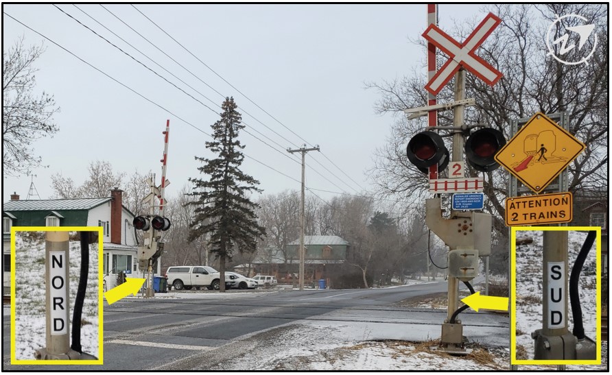 Around 2100, the maintainer went to the Saint-Féréol Road grade crossing. The grade crossing is equipped with automatic warning devices.Footnote 8 The 2 tracks are identified by “NORD” and “SUD” stickers on the signal masts (Figure 3).Footnote 9 The volume of road traffic on this secondary road is considered low.