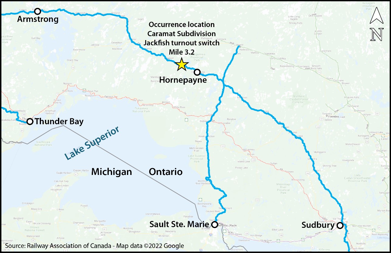 On 28 November 2020 at about 0215, Footnote 1 eastbound Canadian National Railway Company (CN) freight train G87441-25 (the train) departed on the Caramat Subdivision Footnote 2 from Armstrong, Footnote 3 Ontario, located at Mile 243.8, and proceeded en route to Hornepayne, located at Mile 0.0 (Figure 1).