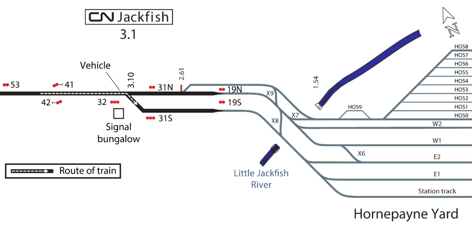 Shortly thereafter, the RTC was contacted by a CN signal maintainer (SM1), who was requesting a track occupancy permit (TOP)Footnote 4 to perform testing at the turnout switch at Jackfish. SM1 requested a TOP for track between Signal 19N (Mile 1.9) and Signal 32 (Mile 3.2). The RTC did not clearly hear the limits that were requested and asked if SM1 wanted to work on the north track, to which SM1 replied that he did. These limits would have permitted SM1 to operate the company hi-rail vehicle, otherwise known as a track unit,Footnote 5 on the north track and the main track up to Signal 32 in order to perform the required testing (Figure 2).