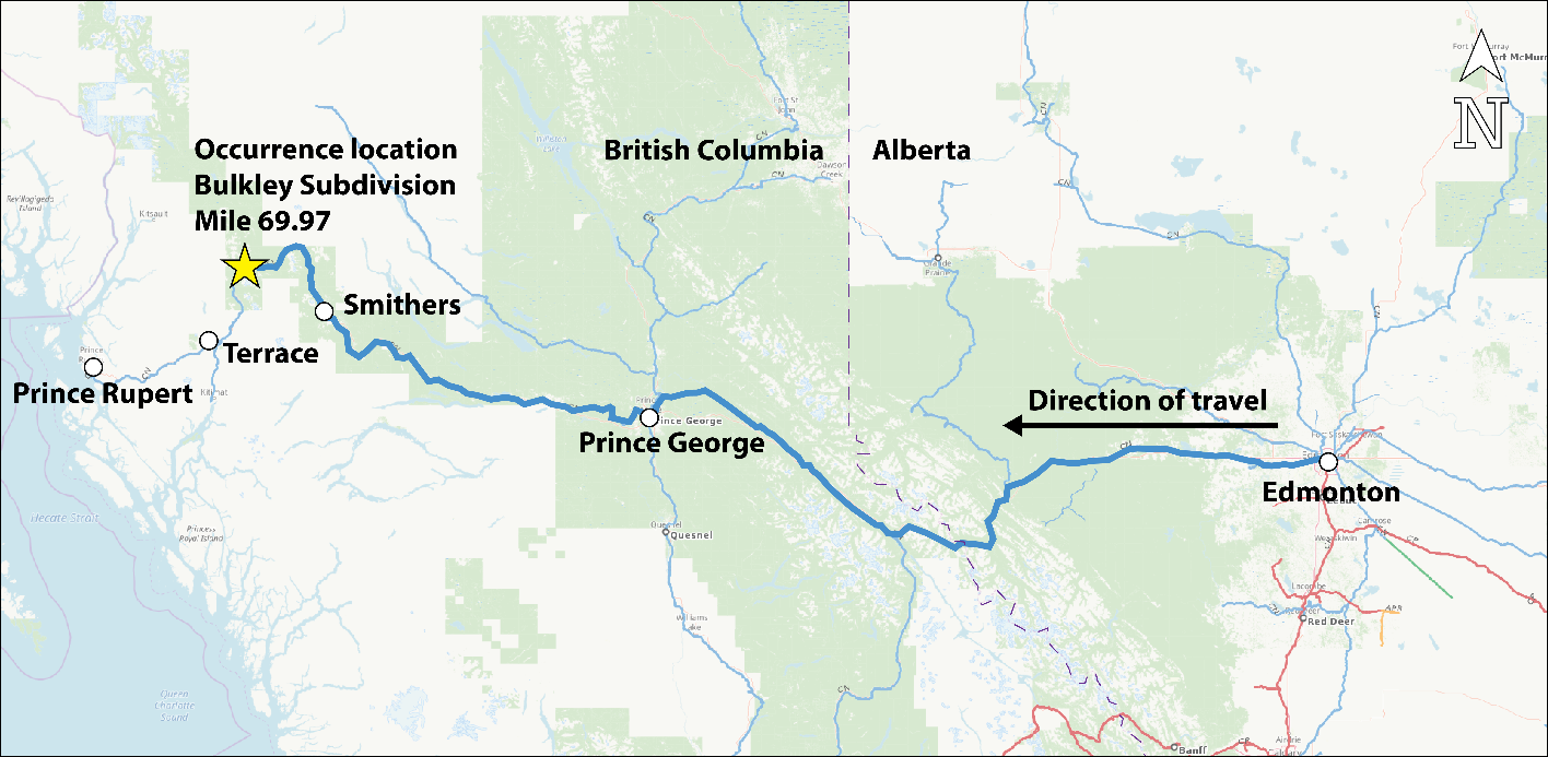 The conventionalFootnote 1 train comprised 2 locomotives and 90 loaded cars. It was 6160 feet long and weighed 11 915 tons. It had departed Smithers, British Columbia (BC), at 0235 destined for Prince Rupert, BC. This train operates daily, originating in Smithers and terminating in Prince Rupert.