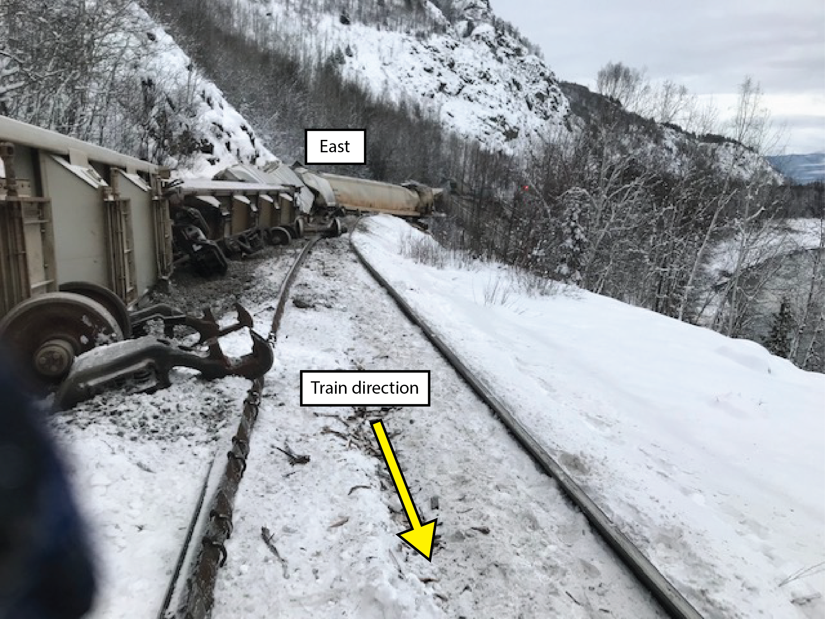 On 08 December 2017, 52 empty coal cars derailed at Mile 35.10 of the Bulkley Subdivision, near Bulkley Canyon, BC (TSB Rail Transportation Occurrence R17V0249). This occurrence was not the subject of a TSB investigation. The railway determined that the derailment was the result of defective or missing rail fasteners.