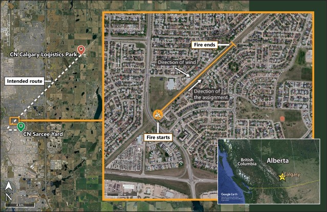 It was later determined that the grass fires extended along the right-of-way for approximately 2376 feet, from 36 Street SE to Erin Mount Crescent pedestrian crossing (Figure 2). They were contained between the track and a wire fence on the east side of the track.