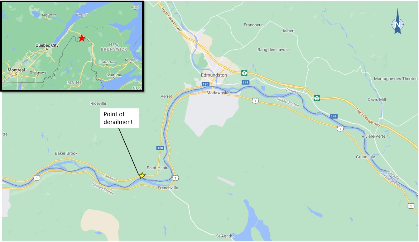 On 26 January 2021, Canadian National Railway Company (CN) train M30631-25 left the Joffre Yard in Lévis, Quebec, en route to Edmundston, New Brunswick. At approximately 2030,Footnote 1 while travelling eastward at 46 mph on the Pelletier Subdivision, a train-initiated emergency brake application occurred near Albertine Station, about 8 miles southwest of Edmundston (Figure 1). Upon inspection by the conductor, 22 cars were found derailed. Eight of the derailed cars were carrying dangerous goods.Footnote 2 There was no fire, and no dangerous goods were released. No injuries were reported.