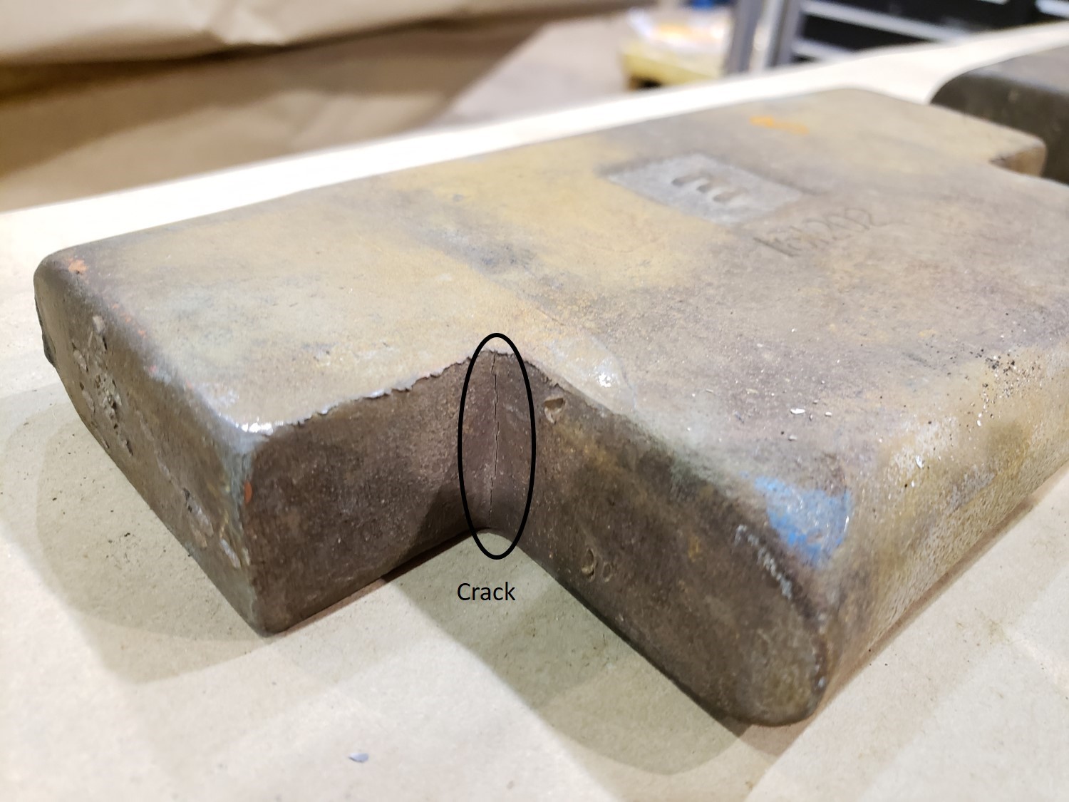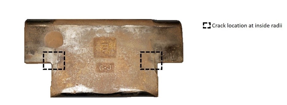 The laboratory examination determined that cracks originating at one or both of the radii were a result of fatigue. Given the sharp angle of the inside radii, there would be higher residual stress in these areas. Furthermore, all examined cross keys had a significant amount of plastic deformation.