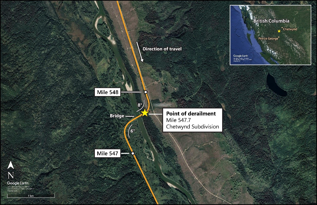 The derailment took place at Mile 547.7 in a remote area about 85 miles north of Prince George. Near the point of derailment in the direction of travel, there is an 8° right-hand curve. The track then crosses a bridge over Parsnip River, after which there is a 6° left-hand curve (Figure 1).