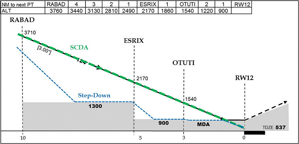 The SCDA technique is used on final approach, below 3200 feet above the ground, during the last 3–5 minutes of the flight, on a descent path similar to that of a precision approach. The step-down technique brings the aircraft down to the minimum obstacle clearance altitude (Figure 1).