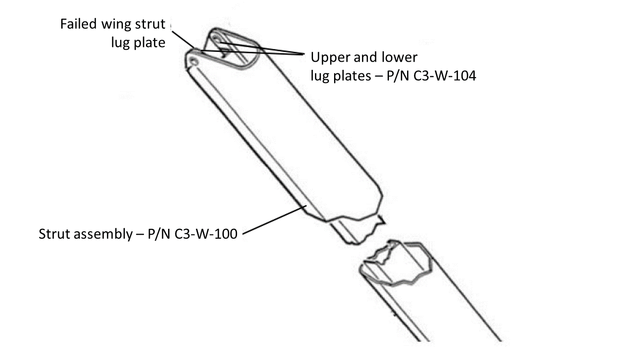 The investigation has revealed that the right wing separated from the fuselage in flight, prior to the impact with the surface of the water. TSB investigators were able to recover the separated wing and noted a suspicious fracture on the lower strut lug plate (P/N C3-W-104) at the strut-to-wing attachment (Figure 1). The failed parts were sent to the TSB Engineering Laboratory in Ottawa, Ontario, for inspection.