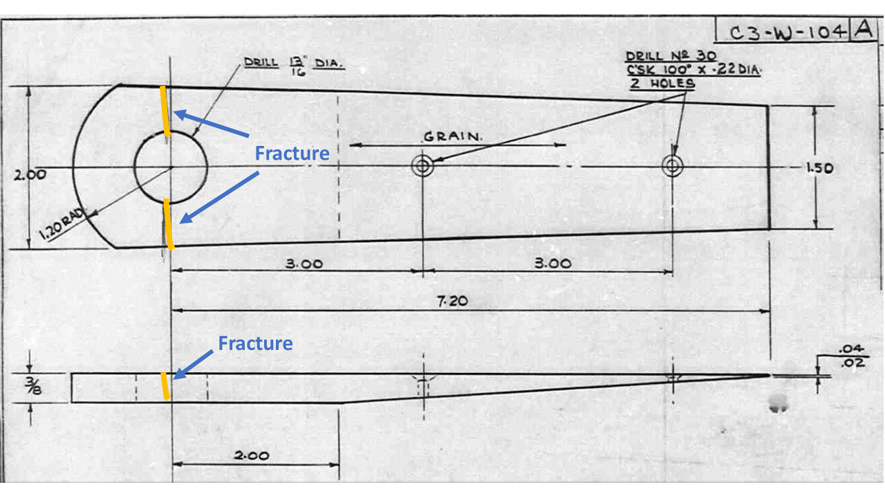 The inspection of the failed lower strut lug plate revealed fatigue cracking across the aluminum surface on the trailing edge side of the bolt bore. The fatigue crack originated at the bottom of the bolt bore and propagated over time until the remainder of the lug plate failed under overload forces during the occurrence flight (Figure 2 and Figure 3).