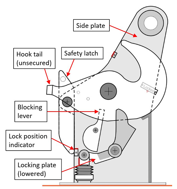 Figures 1 and 2 were created by the TSB Engineering Laboratory to show the primary components of the lifeboat release hooks used in this occurrence, and their hook/locking plate interaction. In order to be reset as designed by the manufacturer, the hooks are initially opened, allowing the blocking lever to move to a vertical position and block the locking plate from rising (Figure 1). In order to reset each release hook, each hook is rotated by a crew member, and as it rotates it interacts with its blocking lever, moving the lever out of the vertical position. The tail of each hook assumes the function of the blocking lever, blocking its locking plate from rising until the hook is rotated such that its tail is in line with the socket of its locking plate. When each tail is aligned with its locking plate socket, the locking plate is no longer blocked and is allowed to rise; the on- or off- load release mechanism can then be reset, which secures each hook in the socket of its locking plate. Once the on- or off-load release mechanism is reset, and each release hook’s reset indicators are aligned, each hook is secure and ready to receive a lifting ring, which is retained by the safety latch (Figure 2).