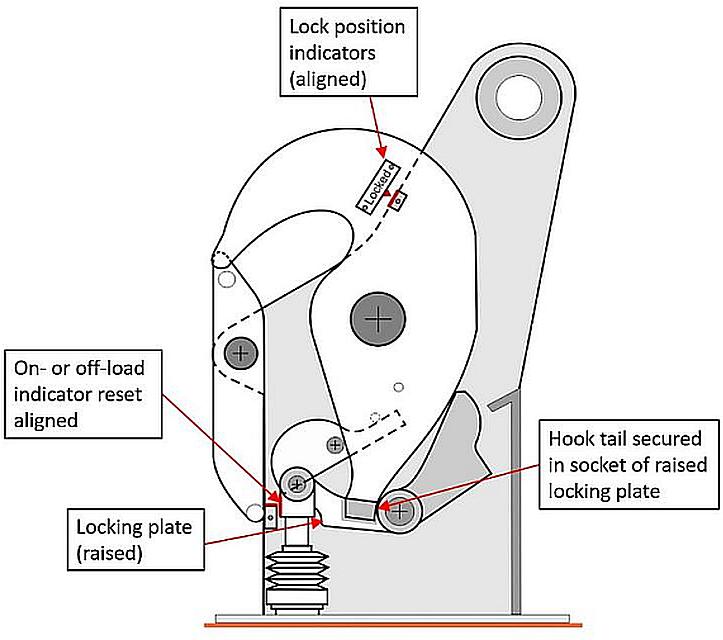 If the blocking lever is bypassed and the tail of each release hook is not rotated to block its locking plate from rising, the locking plate can rise. The on- or off-load release mechanism inside the lifeboat can return to its reset position without the tail of each release hook being secured in the socket of its locking plate. This can give the operator in the lifeboat the impression that the hooks are reset and secured when, in fact, they are not. Testing further identified that the blocking lever can occasionally be held back from the blocking position due to friction between the blocking lever and the side plate of the hook.
