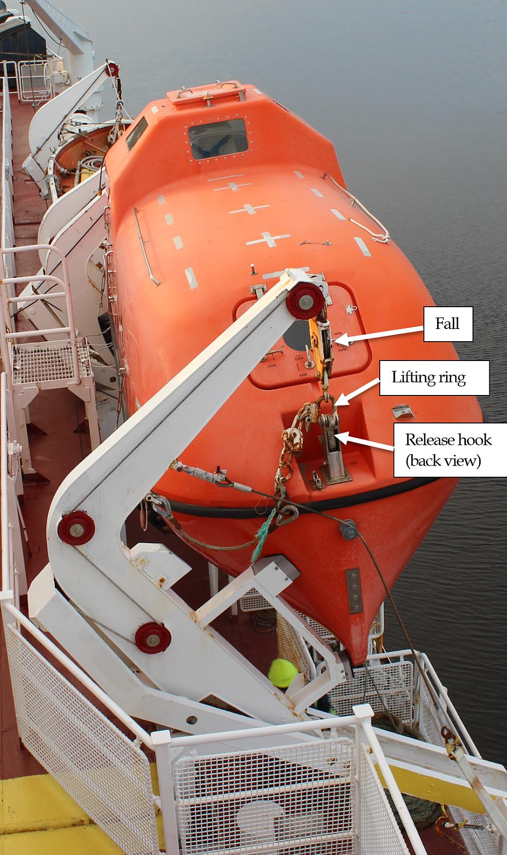 The 28 mm diameter lifting rings used in this occurrence allowed the release hooks to support a load with the lifeboat’s on- or off-load release mechanism reset and hooks unsecured. This may not meet the requirements of section 4.4.7.6.8 of The International Lifesaving Appliance (LSA) Code (2011), which indicates that release hooks should not support a load in the unsecured position.
