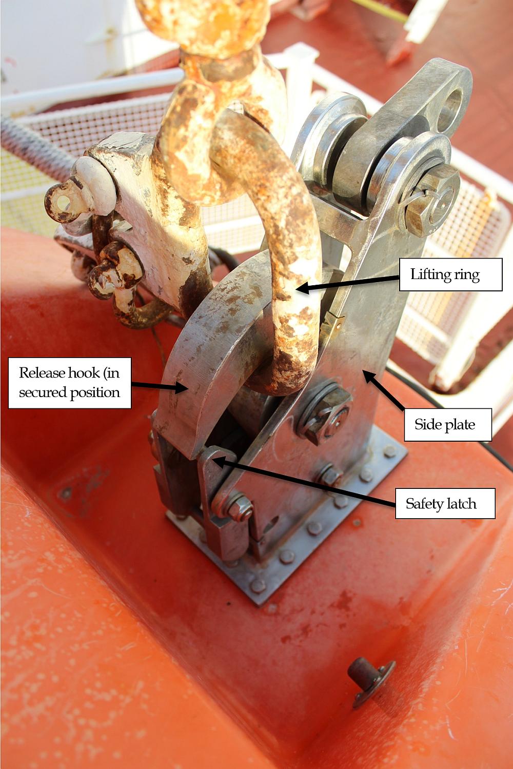 The on- or off-load release mechanism was then intentionally reset without the tail of each hook secured in its locking plate. The 28 mm lifting rings used in the occurrence were inserted in each release hook, and each end of the lifeboat was lifted individually by the crane. When unsecured, each forward and aft release hook supported its portion of the load.