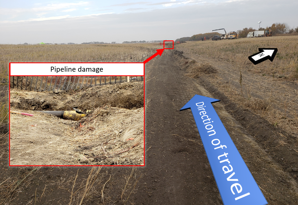 On 05 October 2021, a 6-inch natural gas pipeline was struck by a piece of bladed equipment being pulled by a tractor (Figure 1 ) on agricultural land near McAuley, Manitoba. The Minell pipeline, operated by Manitoba Hydro, ruptured and released approximately 84 000 m3 of natural gas. The released gas did not ignite and no one was injured. The Transportation Safety Board of Canada (TSB) investigation into this occurrence is ongoing.