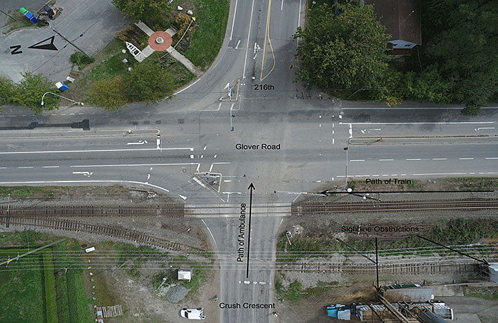 On 11 September 2015, northboundFootnote 1 Canadian National (CN) intermodal train Q10251-11 (the train), operating at 32 mph, struck an eastbound vehicle (the ambulance) at the Crush Crescent–Glover Road crossing located at Mile 18.81 of the Canadian Pacific (CP) Page Subdivision in Langley, British Columbia. The train comprised 3 locomotives, 168 loaded container cars, measured 10,615 feet in length and weighed 10,403 tons. The occupants in the ambulance included 2 paramedics (1 driving, 1 in the patient compartment) and a patient who was being transferred to Abbotsford Hospital. The ambulance driver sustained injuries which were treatable locally. The paramedic in the patient compartment and the patient were transported by air ambulance to hospital where the patient later succumbed to injuries sustained during the collision. The train crew was uninjured (TSB Occurrence No. R15V0191).