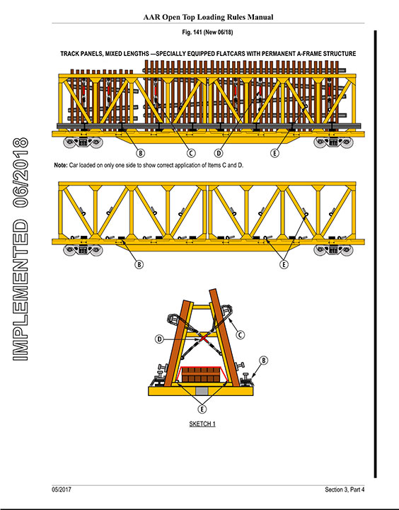 In April 2018, the Railway Association of Canada (RAC) published its open top loading rules for A-frame-type flat cars (Annex A).Footnote 2 Similarly, in June 2018, the Association of American Railroads (AAR) published its open top loading rules (Annex B).Footnote 3 In both the RAC rules and the AAR rules, the following guidance (in part) is provided for securing track materials onto a flat car with an A-frame structure: